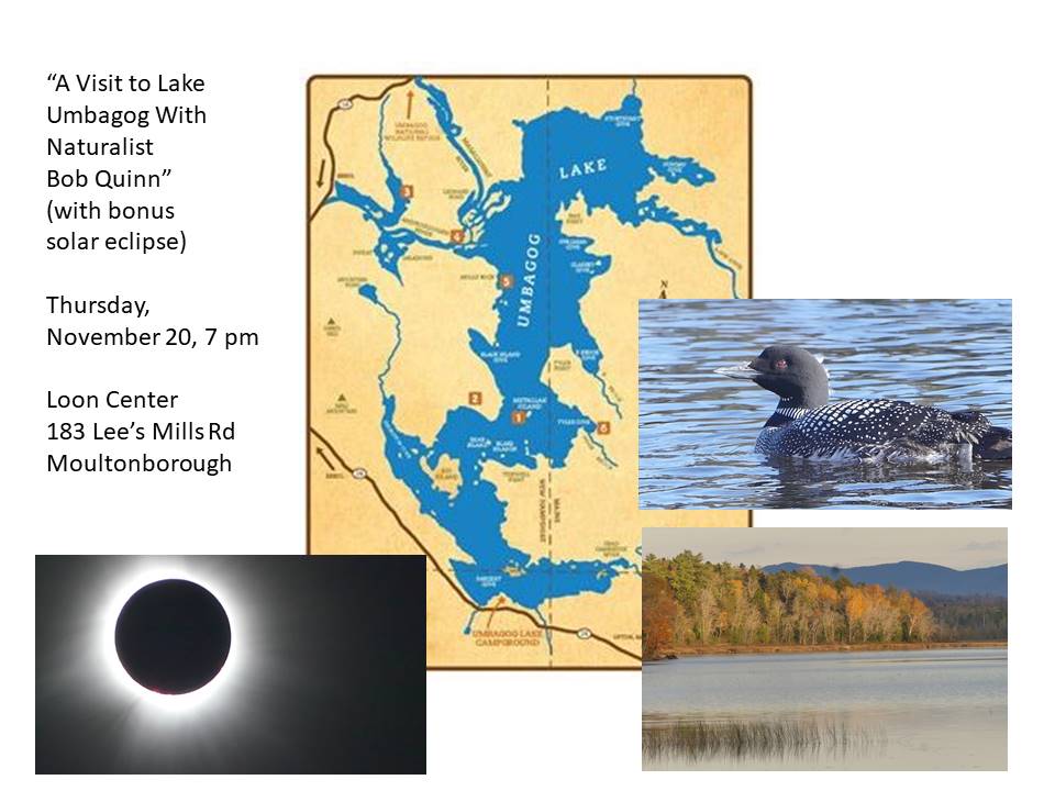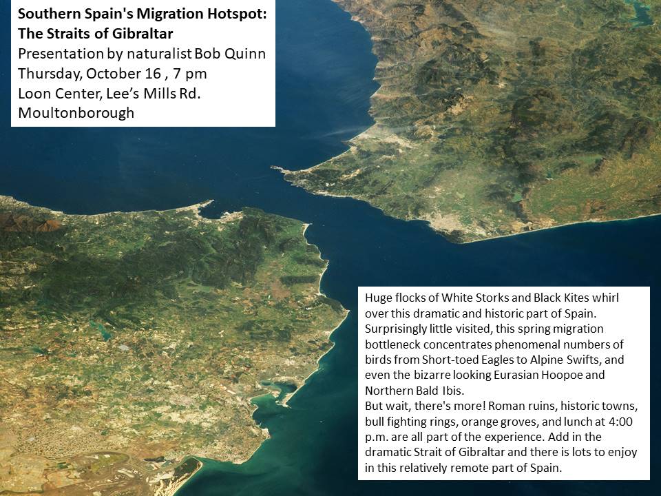 We begin with popular nature photographer Joe Callanan’s program on Otters on Thursday, September 18 at 7 p.m. at the Loon Center. On October 16, old friend Bob Quinn joins us with a program on “The Rock of Gibraltar, Southern Spain’s Migration Hotspot,” and on November 20, Bob and Dana Fox will be our speakers, topic to be decided.