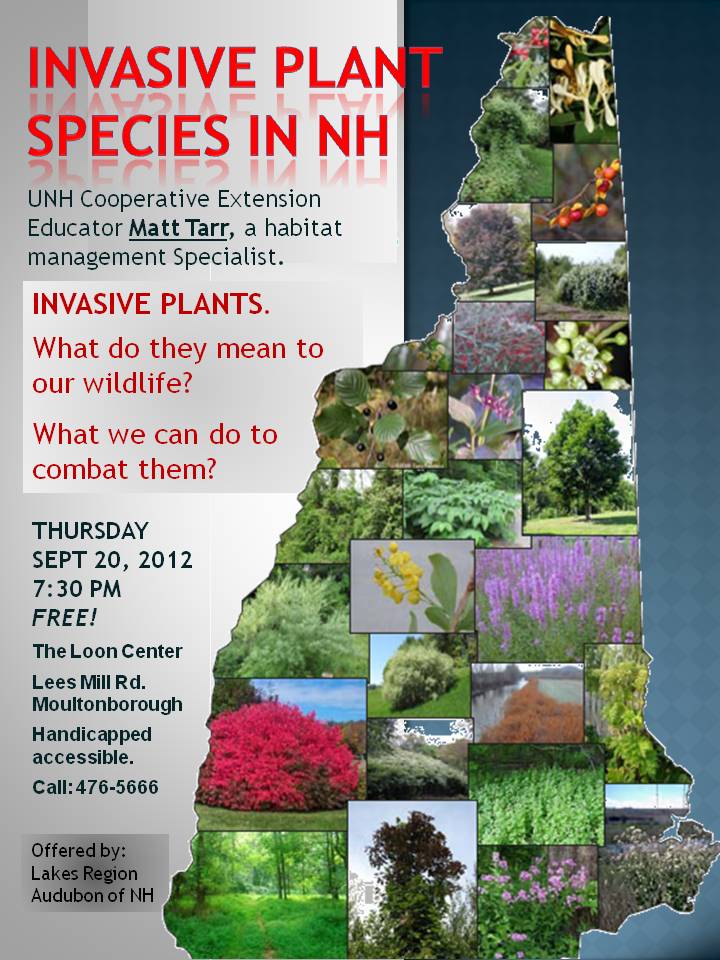 On Thursday September 20, 2012, at The Loon Center, Matt Tarr will discuss invasive plant species if NH: What do they mean to our wildlife? and what we can do to combat them? Matt is a Wildlife Specialist with UNH Cooperative Extension