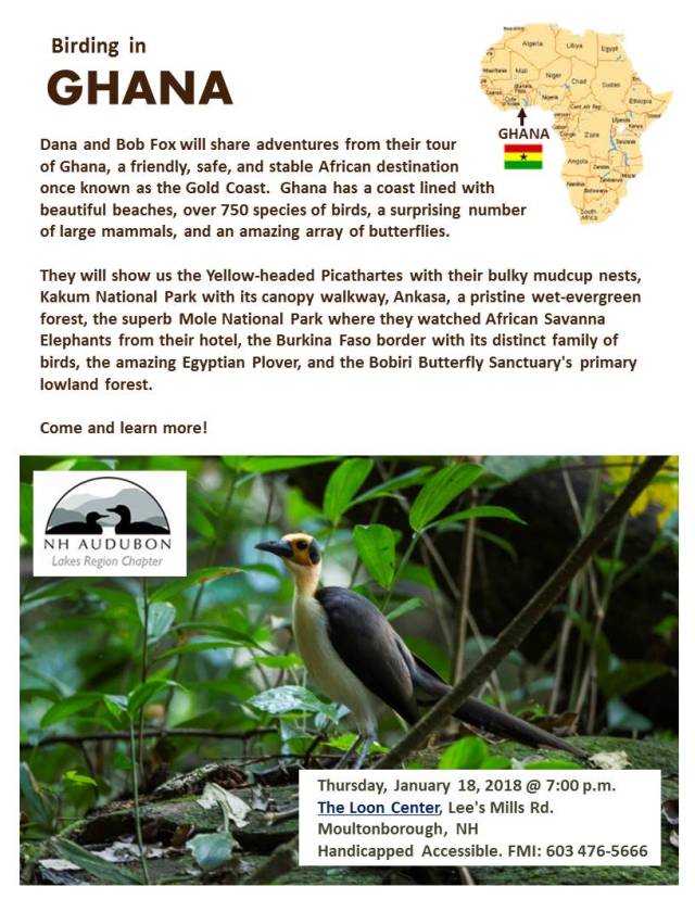 Thanks for the Ghana poster, looks good. I think I saw one of those birds in the zoo a long time ago, can’t think of it’s name. I’m having a hard time getting a response from Dana, but she said January was the only month they could do, so I hope they show up. I have a dvd about juncos for backup.